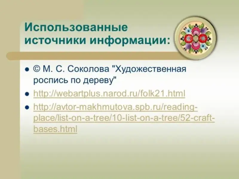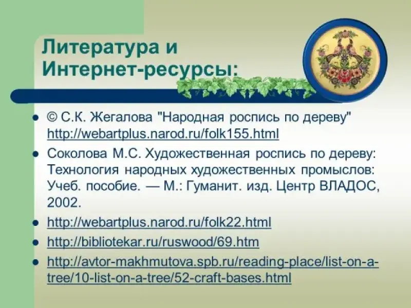 - Соколова М.С. Художественная роспись по дереву. Технология народных художественных промыслов. М.: Гуманитарный издательский центр ВЛАДОС. 2005.