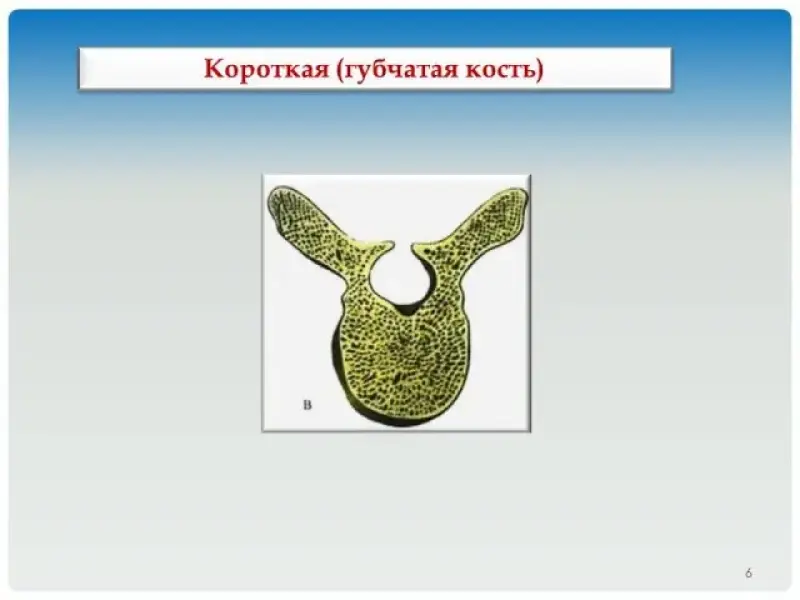 Б) короткие кости (слайд 6) образованы губчатым веществом, поэтому их называют губчатыми. Поверх губчатого вещества расположен тонкий слой компактного вещества. Эти кости имеют кубическую или неправильную форму и располагаются там, где одновременно необходимы большая прочность и подвижность скелета. Это кости тел позвонков, короткие кости запястья и предплюсны. Выполняют также функцию опоры.