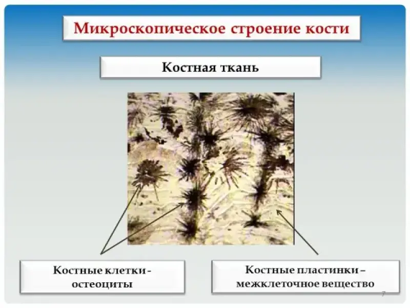 Учитель: Костная ткань представлена костными клетками и костными пластинкам. (слайд 7)