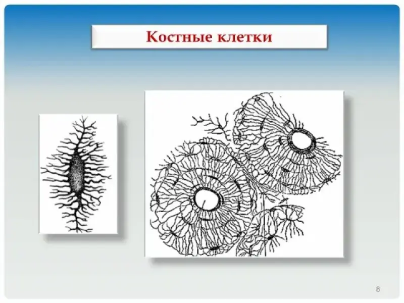 Костные клетки (слайд 8) - имеют отростки, при помощи которых они контактируют друг с другом. Вокруг клеток располагаются мельчайшие канальцы, заполненные межклеточной жидкостью. Через неё происходит питание и дыхание клеток.