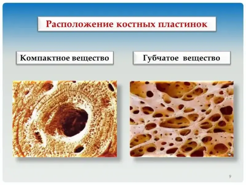 Вокруг костных клеток располагаются костные пластинки - это межклеточное вещество. Оно образуется костными клетками и составляет 2/3 костной ткани. Оно очень твёрдое и прочное. По своим свойствам напоминает камень. Костные пластинки, в зависимости от расположения, образуют компактное (плотное) и губчатое вещество кости. (слайд 9)