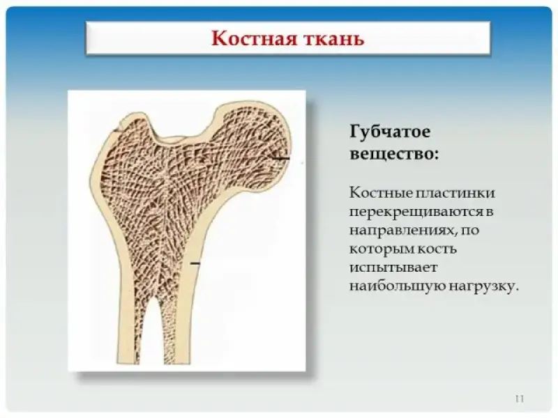 В губчатом веществе (слайд 11) очень тонкие костные пластинки перекрещиваются в тех направлениях, по которым кости испытывают наибольшее растяжение или сжатие. Такое строение позволяет выдерживать большие нагрузки. Промежутки между костными пластинками заполнены красным костным мозгом - кроветворным органом.