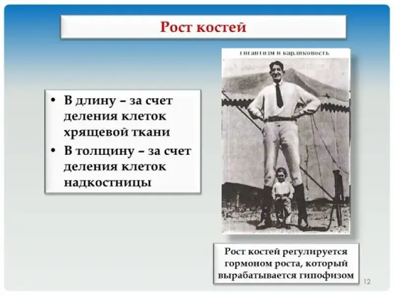 Рост костей регулируется биологически активными веществами - гормоном роста, который вырабатывается гипофизом. Если в детстве вырабатывается слишком много этого гормона, то человек вырастает ростом до 2 метров и более. Если гормона роста вырабатывается мало, то рост взрослых людей не превышает 100 - 120 см.
