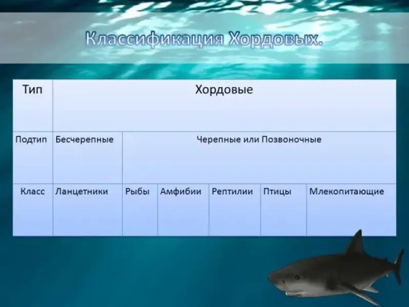 | Класс | Ланцетники | Рыбы | Амфибии | Рептилии | Птицы | Млекопитающие |
