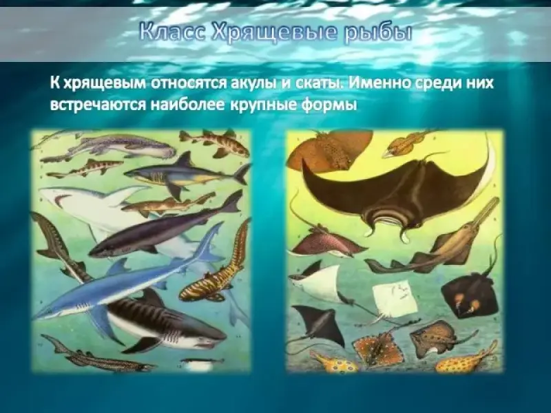 Примерно 400 миллионов лет назад у бесчелюстных появились конкуренты. Они имели мощные челюсти, были тяжеловесными и неуклюжими, вели придонный малоподвижный образ жизни. Голова и передняя часть их тела были покрыты твёрдым панцирем из множества пластин. Это так называемые панцирные рыбы. Животные могли активно хватать и разрывать добычу, обкусывать растения, разламывать крепкие раковины моллюсков и панцири ракообразных. С ними связана первая вспышка формообразования рыб в мелководных девонских морях. Затем появляются челюстножаберные рыбы. И наконец, хрящевые рыбы, которые господствовали 120 млн.лет, и частично сохранились до настоящего времени. Это акулы, скаты, глубоководные химеры. Они обитают в морях, несколько видов - в пресных водах. Для представителей этого класса характерен хрящевой скелет, часто обызвествлённый. Известно около 140 современных родов и около 730 видов. Длина от 6 см. до 20 м. Плавательного пузыря нет. Оплодотворение внутреннее. Живорождение (редко), яйцеживорождение или откладывание крупных яйц.