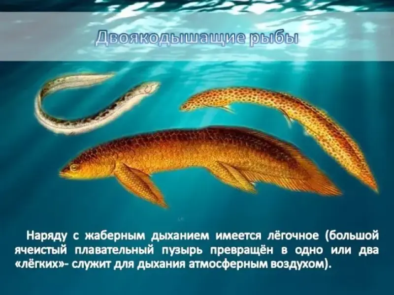 Наряду с жаберным дыханием у некоторых рыб имеется лёгочное дыхание (большой ячеистый плавательный пузырь превращён в одно или два "лёгких", которые служат для дыхания атмосферным воздухом). В настоящее время известно шесть реликтовых видов двоякодышащих рыб. (Слайд 10)