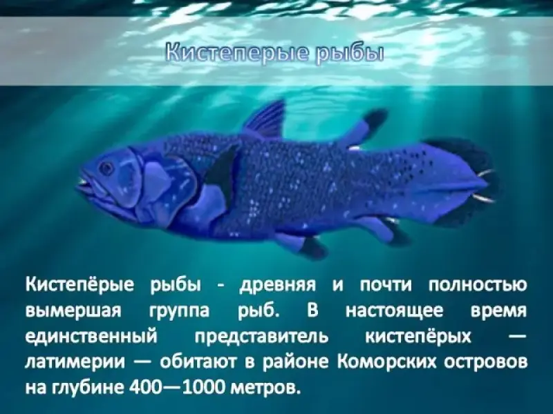 Кистепёрые рыбы - древняя и почти полностью вымершая группа рыб. В настоящее время единственный представитель кистепёрых - латимерии - обитают в районе Коморских островов на глубине 400-1000 метров. (Слайд 11)