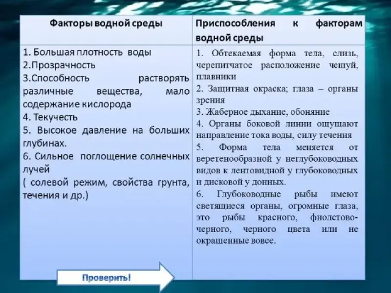 | Факторы водной среды | Приспособления к факторам водной среды |