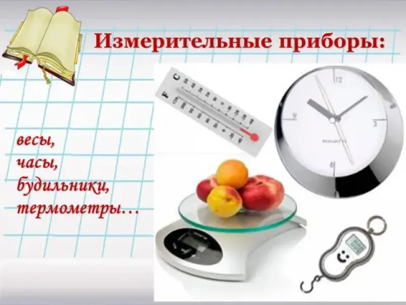 - Измерительные приборы - весы, часы, будильники, термометры (слайд №4)