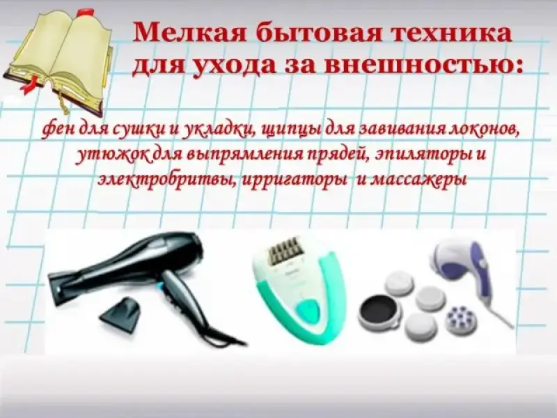 - Мелкая бытовая техника для ухода за внешностью: фен для сушки и укладки, щипцы для завивания локонов, утюжок для выпрямления прядей, эпиляторы и электробритвы, ирригаторы и массажеры. (слайд №9)