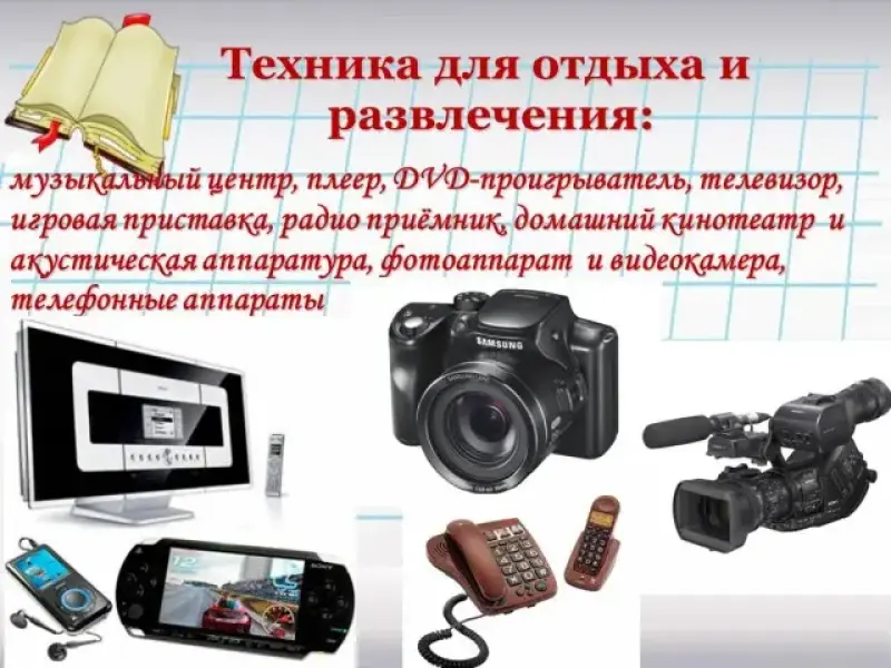 - Техника для отдыха и развлечения: музыкальный центр, плеер, DVD-проигрыватель, телевизор, игровая приставка, радио приёмник, домашний кинотеатр и акустическая аппаратура, фотоаппарат и видеокамера, телефонные аппараты; (слайд №10)