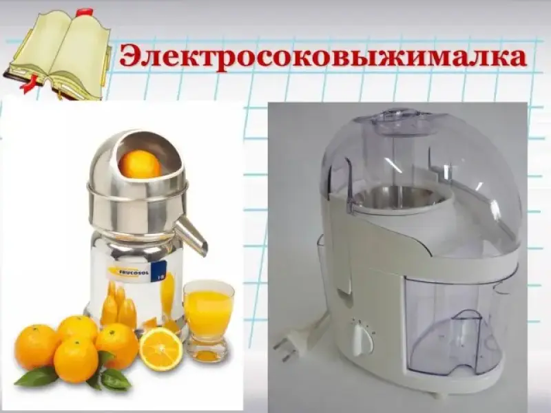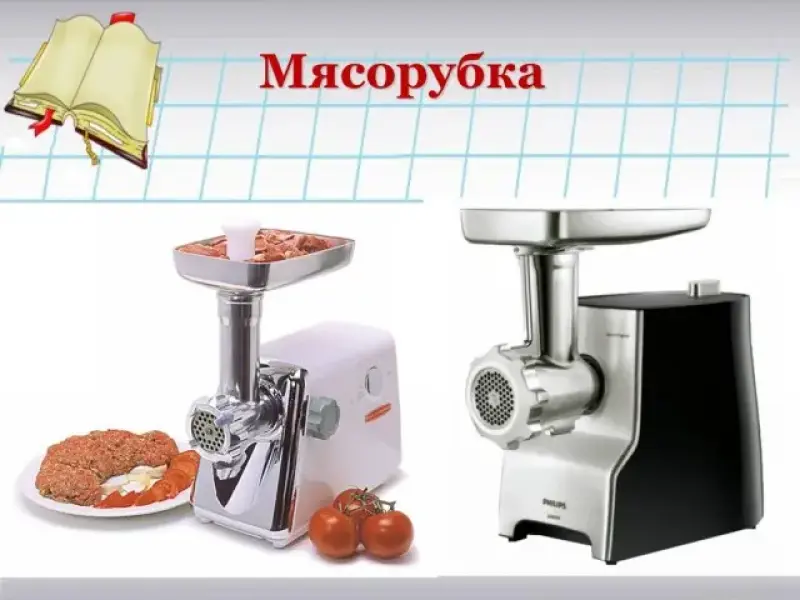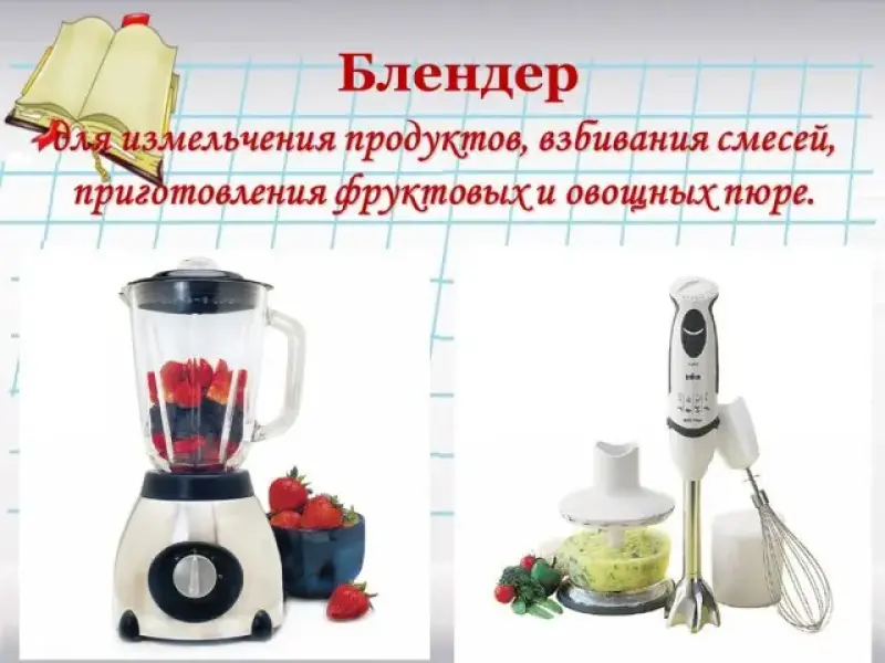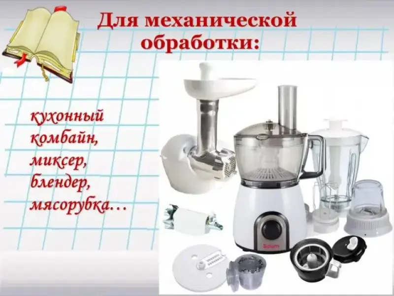 - Для механической обработки: кухонный комбайн, миксер, блендер, мясорубка; (слайд №12)