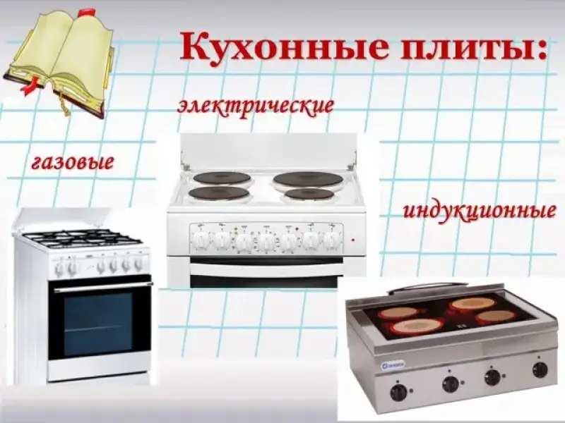 Кухонная плита - нагревательный прибор, предназначенный для приготовления пищи. Состоит из варочной поверхности, духового шкафа и дополнительных отделений. По типу используемого топлива кухонные плиты бывают: газовые, электрические, индукционные. (слайд №16)