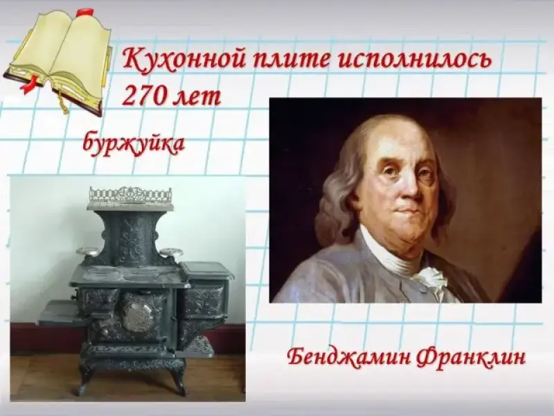 Кухонной плите исполнилось 270 лет. Созданием этого необходимого предмета кухонного интерьера мы обязаны известному учёному и политику Бенджамину Франклину (11 июня 1742 года). (слайд №17)