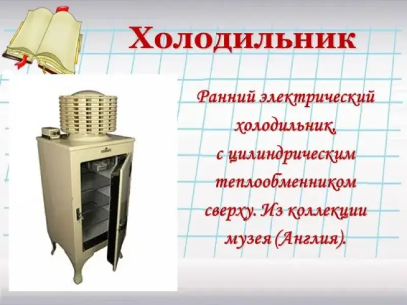 Ранний электрический холодильник, с цилиндрическим теплообменником сверху. Из коллекции музея (Англия). (слайд №19)