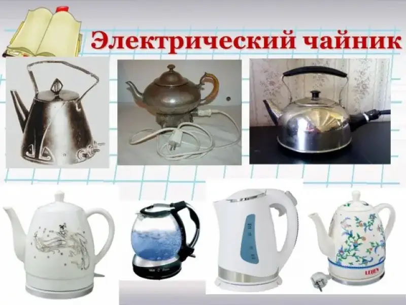 Электримческий чамйник - прибор для нагревания питьевой воды, работающий на электричестве. Представляет собой чайник с расположенным внутри нагревательным элементом. (слайд №26)