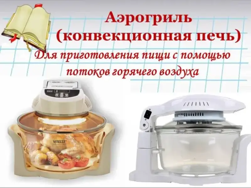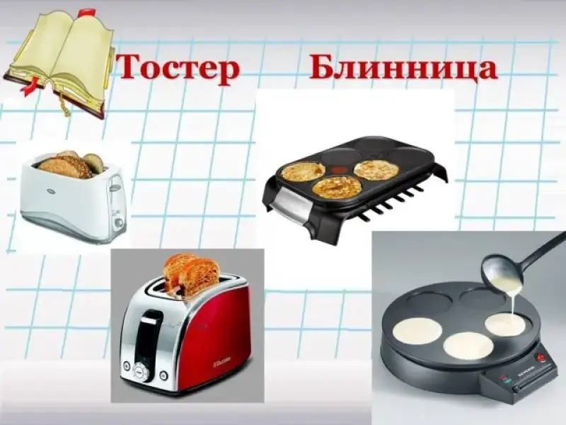 - Для термической обработки: электрическая или газовая плиты, микроволновая печь, хлебопечка, мультиварка, пароварка, гриль, аэрогриль, фритюрница, тостер, вафельница, блинница, йогуртница...(слайд №13)