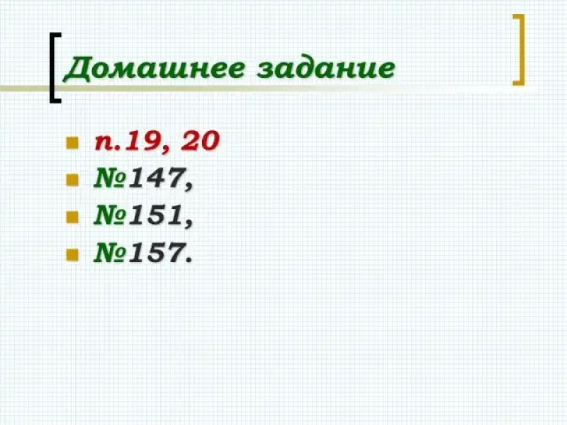 Организует фронтальный опрос учащихся СЛАЙД 2 СЛАЙД 3 СЛАЙД 4 Проверка домашнего задания №140, 143, 154 [1] СЛАЙД 4 СЛАЙД 5 СЛАЙД 6 Учитель оценивает ответы учащихся, выставляет отметки. |