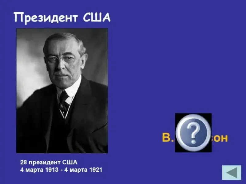 Томас Вудро Вильсон (1856-1924 гг.), президент США (1913-1921 гг.), демократ. Инициатор вступления США в Первую мировую войну. В январе 1918 г. выдвинул программу мира из 14 пунктов, направленную на установление господства США в международных делах. Инициатор создания Лиги Наций, за что получил Нобелевскую премию мира 1919 г.