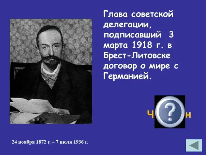 5. Глава советской делегации, подписавший 3 марта 1918 г. в Брест-Литовске договор о мире с Германией. (Георгий Васильевич Чичерин)