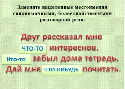 1. Замените выделенные местоимения синонимичными, более свойственными разговорной речи. СЛАЙД 15-16 Друг рассказал мне нечто интересное (что-то)