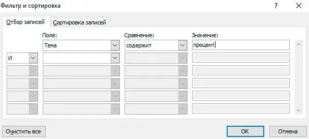 В выпадающем списке Поле выбрать пункт «тема», в списке Сравнение выбрать «содержит», в поле Значение ввести слово для поиска «процент» <Рисунок2>.