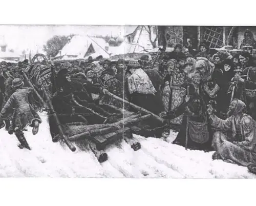 Теперь, когда вы узнали биографию раскольницы, вам легче представить сюжет картины Сурикова. Историки, описывая увоз боярыни из дома в место заключения (Печёрский монастырь), сообщают, что дровни намеренно везли через Кремль, мимо Чудова монастыря, "под царские переходы", чтобы царь мог видеть свою противницу в грязных дровнях с жалкой клячей, выставленную на посмешище народа.