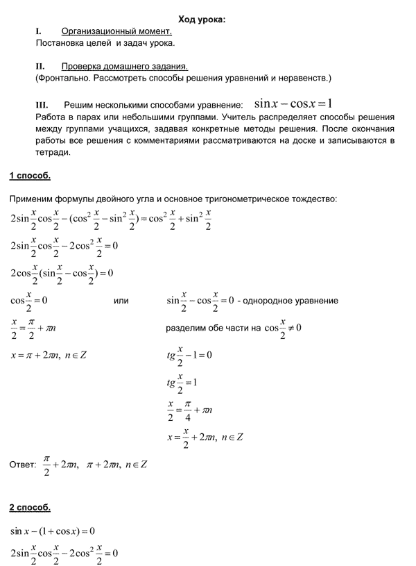 Урок одного уравнения (неравенства) формирует навык исследовательской работы, развивает сообразительность, повышает интерес учащихся к работе. Такой урок лучше проводить, когда учениками усвоены необходимые понятия и разобран ряд приёмов решения уравнений и неравенств.