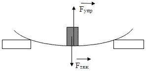 Учитель: Горизонтально расположенная линейка на опорах. Если поставить гирю на эту линейку, то она начнет прогибаться по мере движения гири вниз. Линейка деформировалась и при определенной величине деформации, линейка и гиря останавливаются, гиря движется вниз до тех пор, пока сила на гирю со стороны линейки не уравновесит силу тяжести.