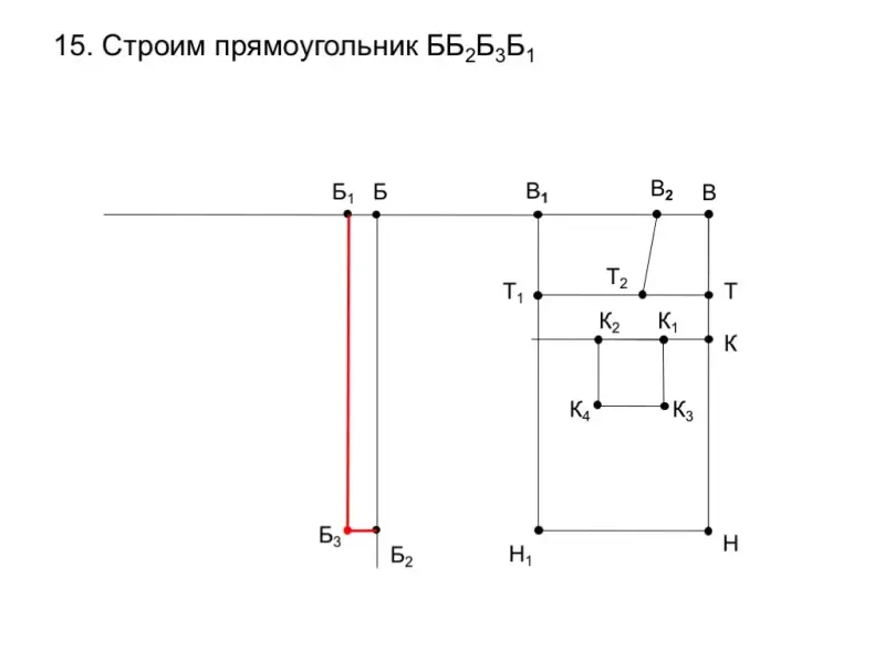 Самым доступным и простым является чертеж, изображающий плоские фигуры. Такие фигуры имеют два измерения: длину и ширину. Вертикальная и горизонтальная линии, пересекаясь, дают точки, которые отмечают какими-либо буквами. Обычно исходную точку обозначают буквой, например: А, и от этой буквы начинается построение чертежа (в нашем чертеже исходной буквой является точка В). Каждый отрезок на чертеже отмечен двумя буквами. Первая буква указывает на то, что нужную величину откладывают от нее.