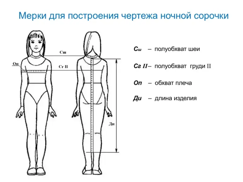 Мерки для построения чертежа ночной сорочки с цельнокроеным рукавом.