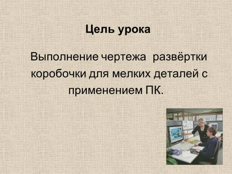 5. Обращает внимание учащихся на обучающий стенд для выполнения чертежа развертки коробочки с применением ПК (приложение). 6. Как бы Вы сформулировали задачу сегодняшнего урока? Помогает учащимся справиться с технической терминологией. |