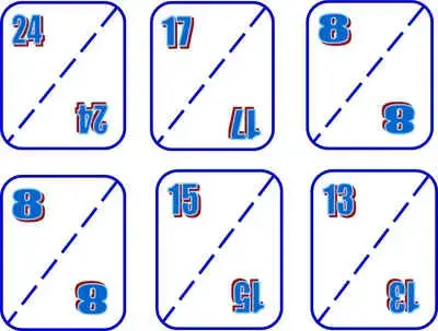 Делаются они так: берутся два набора чисел от 1 до 24 (для чисел удобно использовать старый настенный календарь). Всего 48 карт. На каждой карте (основа - картон) делается одно число в двух противоположных углах, чтобы тому, кто сидит напротив, было удобно смотреть на это же число (см. рисунок).