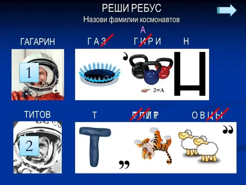Ведущий 2: Начиная с полёта Ю. Гагарина, в космосе побывало более 500 человек. На этапе "Реши ребус" мы вспомним только 8 человек, которые побывали в космосе. Команды выполняют задание, помня правила составления и решения ребусов. <Приложение 1> <Приложение 4>, <Рисунки 1-8>