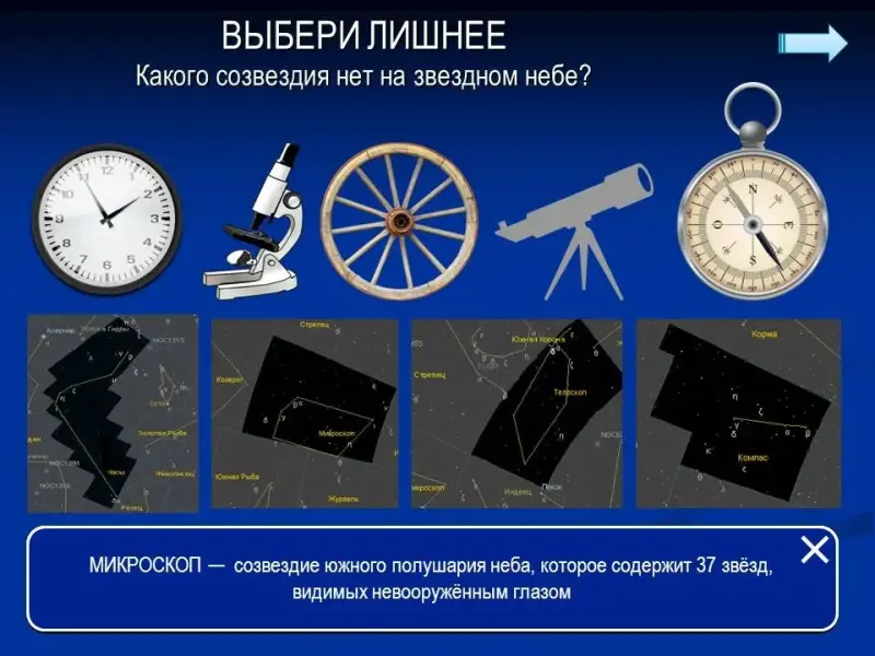 Ведущий 2: Продолжим игру этапом "Выбери лишнее", теперь команды должны определить, какое созвездие невозможно найти на звездном небе <Приложение 1>