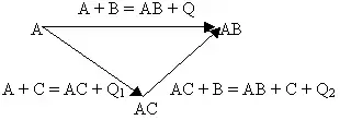 На схеме образование соединения АВ представлено двумя путями: непосредственным синтезом из веществ А и В (Q) и через стадию образования промежуточного соединения АС (Q1), которое в дальнейшем взаимодействует с веществом В (Q2) и дает тот же конечный продукт АВ. В соответствии с законом Гесса тепловой эффект прямого синтеза продукта АВ равен сумме тепловых эффектов реакций с участием промежуточного продукта АС, то есть: