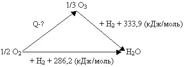 Пример № 1. При стандартных условиях теплота сгорания водорода в кислороде равна 286,2 кДж/моль, а теплота сгорания водорода в озоне равна 333,9 кДж/моль. Чему равна теплота образования озона из кислорода при стандартных условиях?