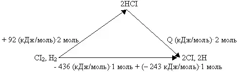 Пример № 2. Энергии диссоциации Н2, СI2 и тепловой эффект образования HCI составляют соответственно -436, -243 и + 92 кДж/моль. Чему равна энергия диссоциации HCI?