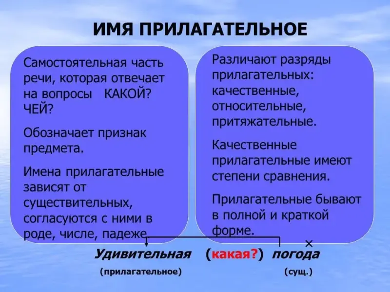 Имя прилагательное согласуется с существительным в роде, числе, падеже; относится к одному из трех разрядов: качественным, относительным, притяжательным.