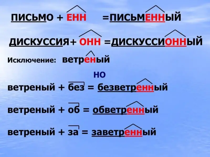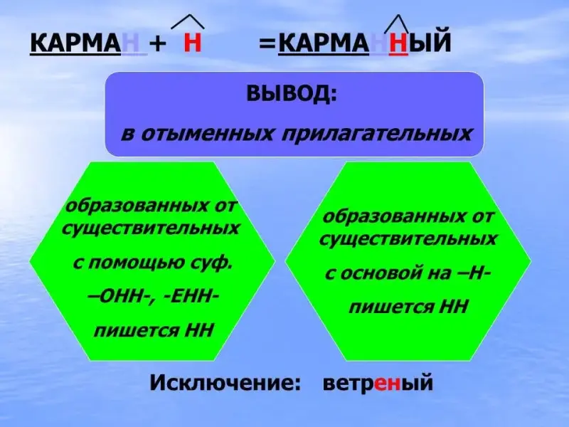 б) В отыменных прилагательных, образованных от существительных с основой на - Н-, при помощи прибавления суффикса -Н- - пишется две буквы -Н-).