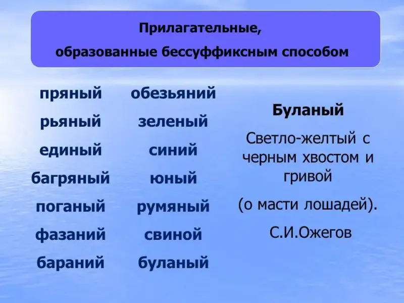 - Выучить прилагательные, образованные бессуффиксным способом.