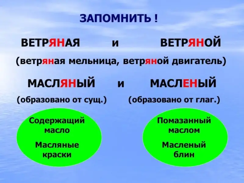 7. Следует различать прилагательные МАСЛЯНЫЙ и МАСЛЕНЫЙ.