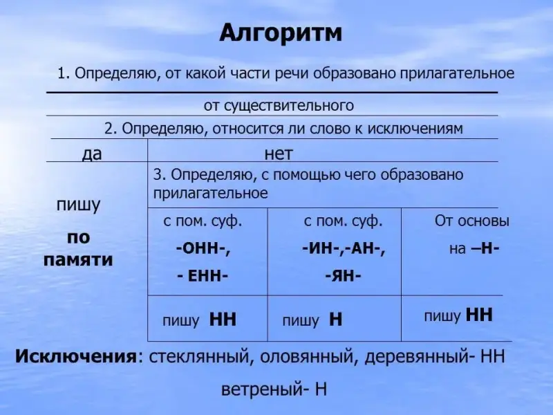 Из этого правила есть исключение: СТЕКЛЯННЫЙ, ОЛОВЯННЫЙ, ДЕРЕВЯННЫЙ. В этих словах в суффиксах пишется - НН -.