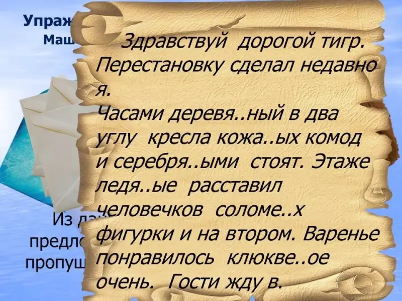 Перестановку сделал недавно я. Часами деревя..ный в два углу кресла кожа..ых комод и серебря..ыми стоят. Этаже ледя..ые расставил человечков соломе..х фигурки и на втором. Варенье понравилось клюкве..ое очень. Гости жду в.