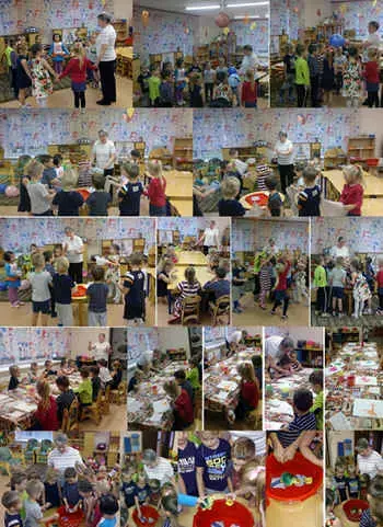 Материал: воздушные шары разных цветов и размеров, полиэтиленовые пакеты на каждого ребёнка, трубочки, пластмассовые стаканчики, 2 баночки с плотными крышками, краски, бумага, резиновая игрушка, вода в кувшине, 2 пустые бутылки.