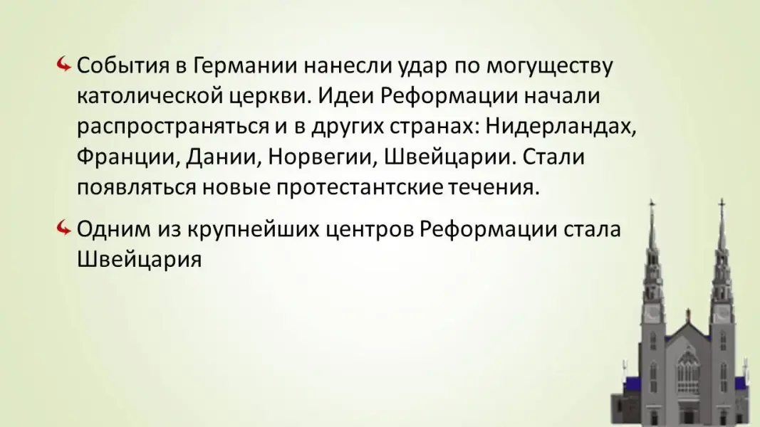 События в Германии нанесли удар по могуществу католической церкви. Идеи Реформации начали распространяться и в других странах: Нидерландах, Франции, Дании, Норвегии, Швейцарии. Стали появляться новые протестантские течения. Одним из крупнейших центров Реформации стала Швейцария .(слайд 3)