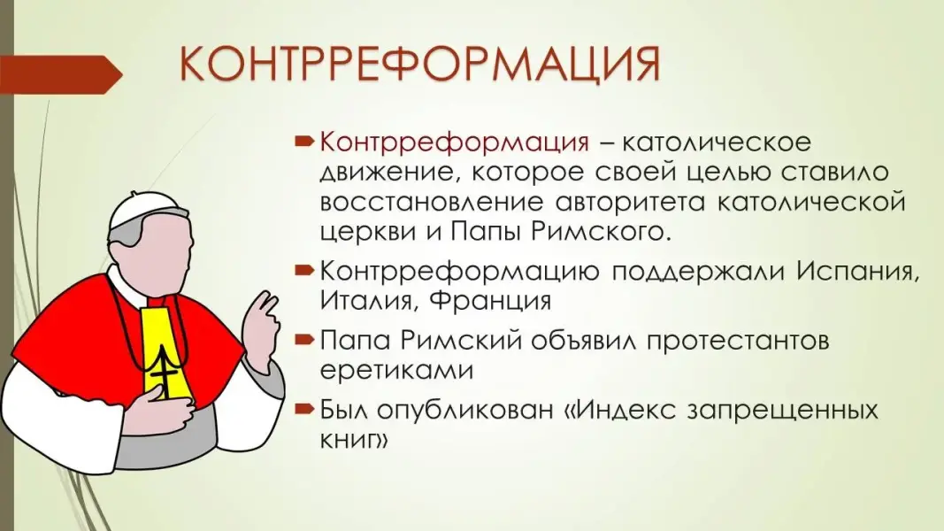 - Контрреформация - католическое движение, которое своей целью ставило - восстановление авторитета католической церкви и Папы Римского.