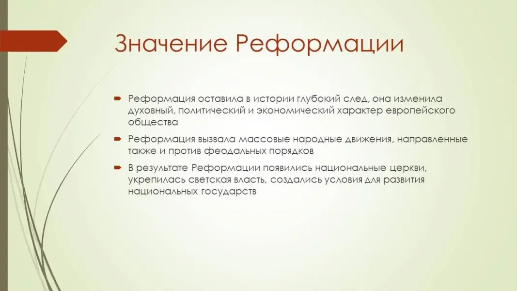 В результате Реформации появились национальные церкви, укрепилась светская власть, создались условия для развития национальных государств