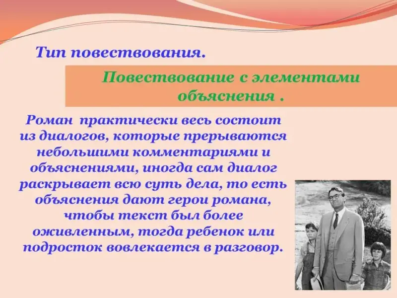 Учитывая особенности детской и подростковой литературы, а также типы повествования, мы считаем, что в художественном произведении "Убить пересмешника" Ли использует повествование с элементами объяснения. Автор затрагивает важнейшие темы, в которых раскрываются проблемы общества, и для того, чтобы понять сущность этих проблем она прибегает к их постановке, а затем к определенным комментариям, которые должны стать очевидными и понятными для детей и подростков по мере его прочтения.