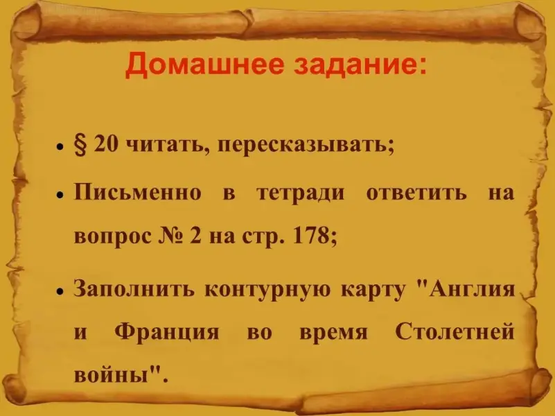 Домашнее задание: Глава VII, параграф 20. Задание: ответить на вопрос № 2 на стр. 178, письменно в тетради, заполнить контурную карту "Англия и Франция во время Столетней войны".